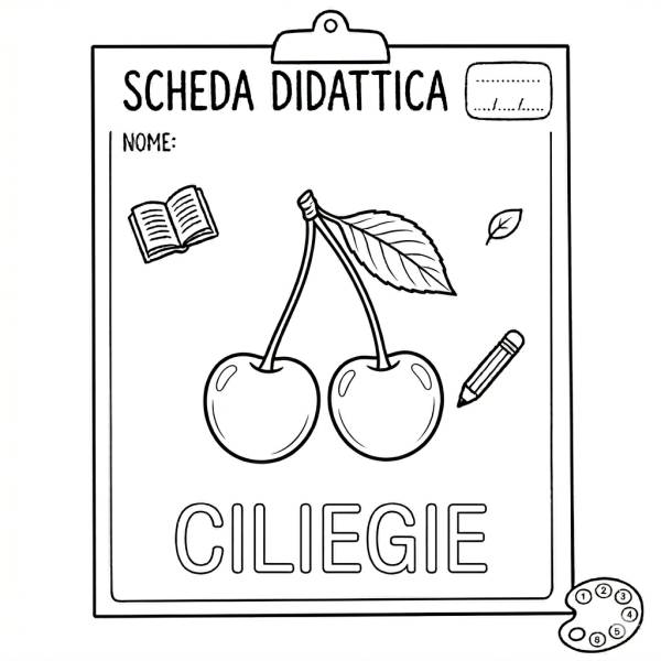 Il disegno rappresenta una scheda didattica per apprendimento scolastico con l' aiuto dei disegni,ha come oggetto la parola ciliegie. Il disegno è in bianco e nero con bordi ideale da colorare