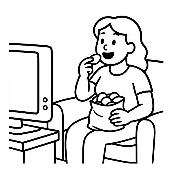 Il disegno mostra una signora che mangia patatine mentre guarda la TV. Il disegno è in bianco e nero con bordi, ideale da colorare