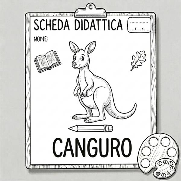 Un simpatico canguro stilizzato è il protagonista di una scheda didattica fissata su una cartellina a molletta. Attorno all'animale sono disposti elementi come un libro aperto, una foglia e una matita, mentre in basso campeggia il nome della specie. Una tavolozza per pittori è posizionata in un angolo esterno per suggerire l'attività creativa.