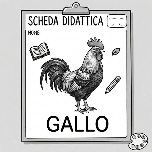 Una scheda didattica fissata a una cartellina con molletta presenta l'immagine centrale di un gallo dai dettagli minuziosi. Accanto all'animale compaiono icone di un libro, una foglia e una matita, mentre in basso campeggia il nome della specie in caratteri grandi. L'intero set poggia su uno sfondo grigio neutro con una piccola tavolozza numerata in un angolo.