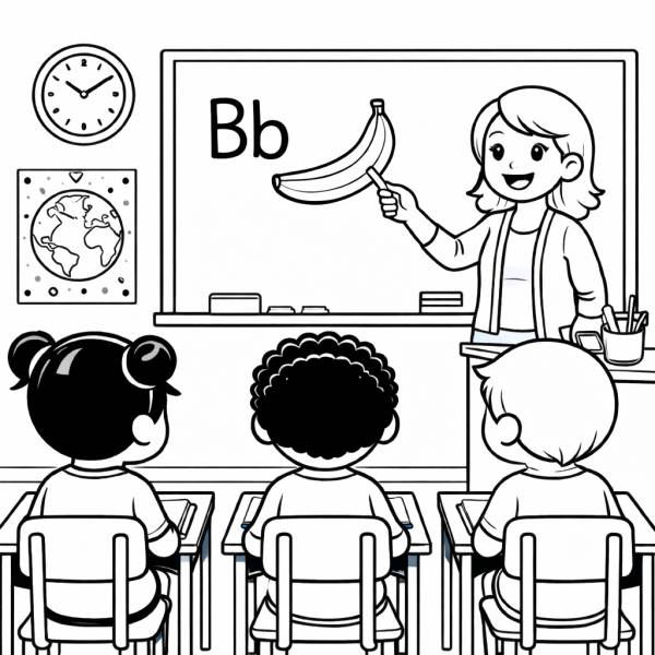 Il disegno rappresenta un insegnante che spiega agli studenti in classe, la lettera b, con un disegno di un frutto, la banana, che inizia con la lettera b. Il disegno è in bianco e nero con bordi ideale da colorare.