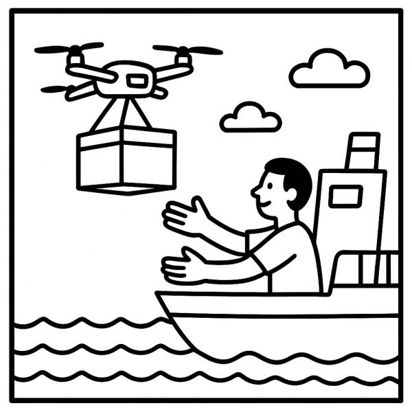 Il disegno mostra un drone che consegna un pacco ad un uomo in barca. Il disegno è in bianco e nero con bordi, ideale da colorare