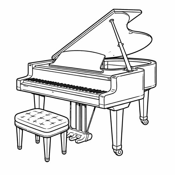 Il disegno rappresenta un pianoforte a coda. Il disegno è in bianco e nero con bordi ideale da colorare