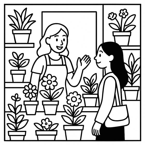 Il disegno rappresenta un negozio di piante, nel negozio una commessa mostra le piante ad una cliente. Il disegno è in bianco e nero con bordi ideale da colorare.