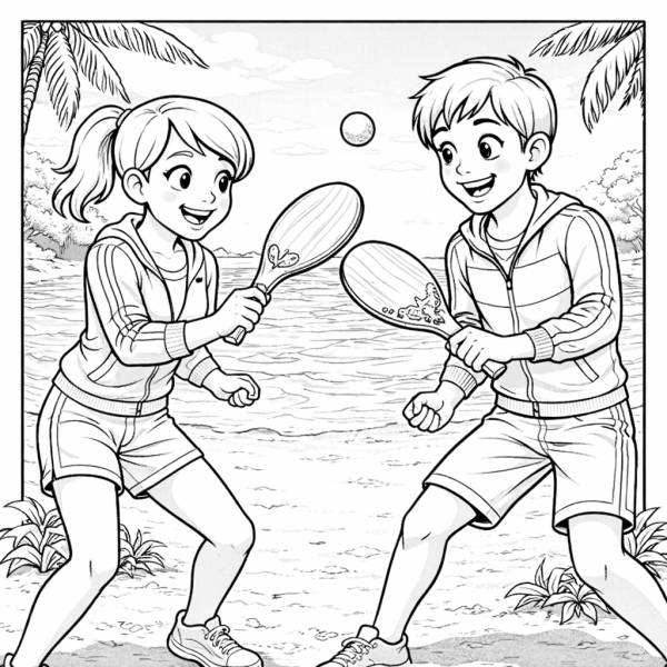 Il disegno rappresenta una coppia che gioca con racchette. Il disegno è in bianco e nero con bordi ideale da colorare.