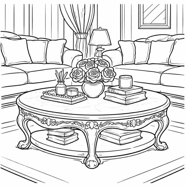 Il disegno rappresenta un tavolino di lusso in un salotto, sopra c'è un vaso di fiori e dei libri, ci sono divani, tende, specchio ed una lampada da tavolo. Il disegno è in bianco e nero con bordi ideale da colorare.