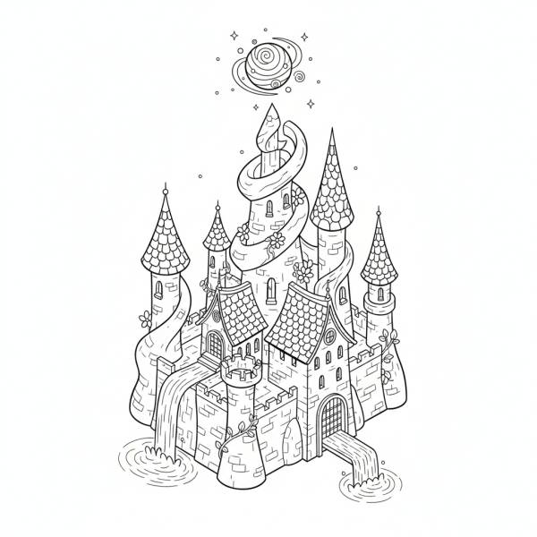 Il disegno rappresenta un castello incantato. Il disegno è in bianco e nero con bordi ideale da colorare